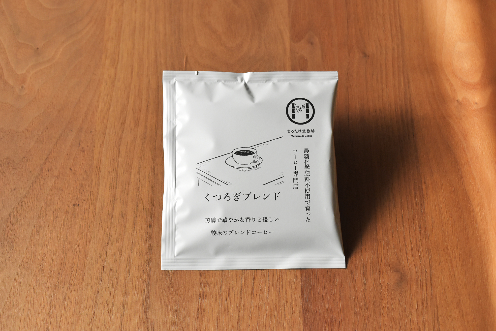 パッケージの制作事例。浜松市中央区佐鳴台にお店を構える「まるたけ堂珈琲」さんのドリップパック「くつろぎブレンド」のリニューアルデザイン...